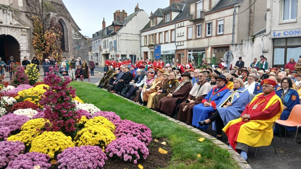 A la fin de la messe, sur la place de l’église, les confréries ont été présentées et chacune a pu annoncer la date de son prochain chapitre, puis quelques intronisations ont eu lieu suivi d’un vin d’honneur offert par la Faisanderie avec dégustation de la terrine de faisan, leur spécialité.