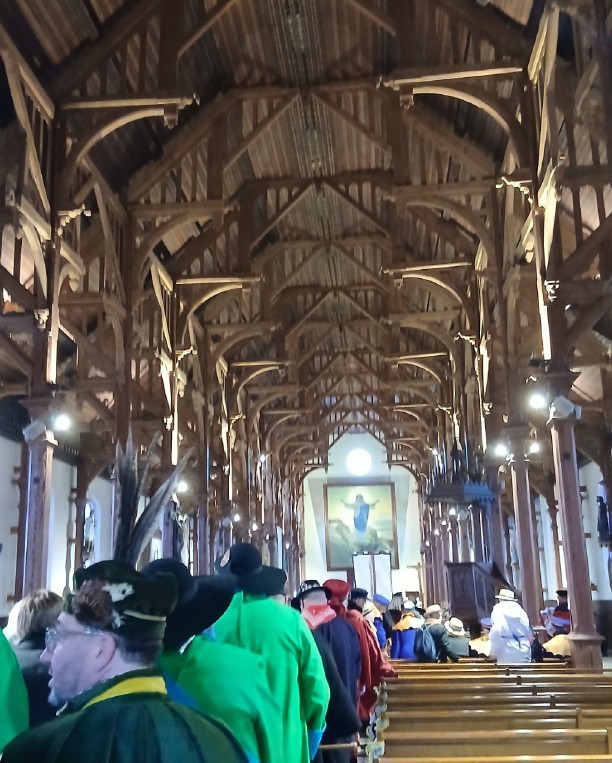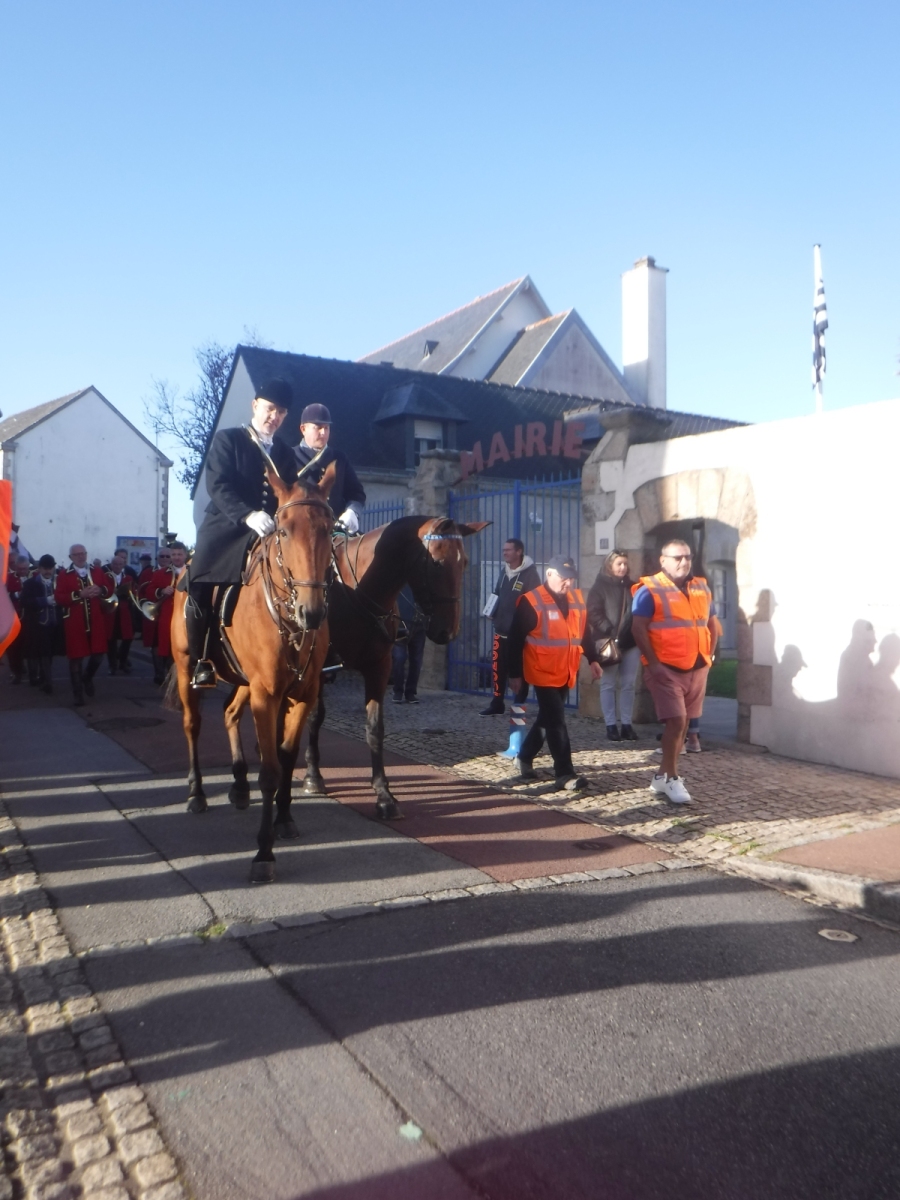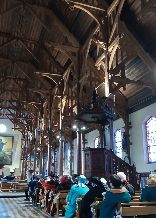 Le dimanche matin, nous avons pris notre petit déjeuner dans l’espace Petit Breton, suivi d’un défilé jusqu’à l’église Saint Gildas de Pénestin,de style néogothique, accompagnés des trompes de chasse, afin d’assister au chapitre.