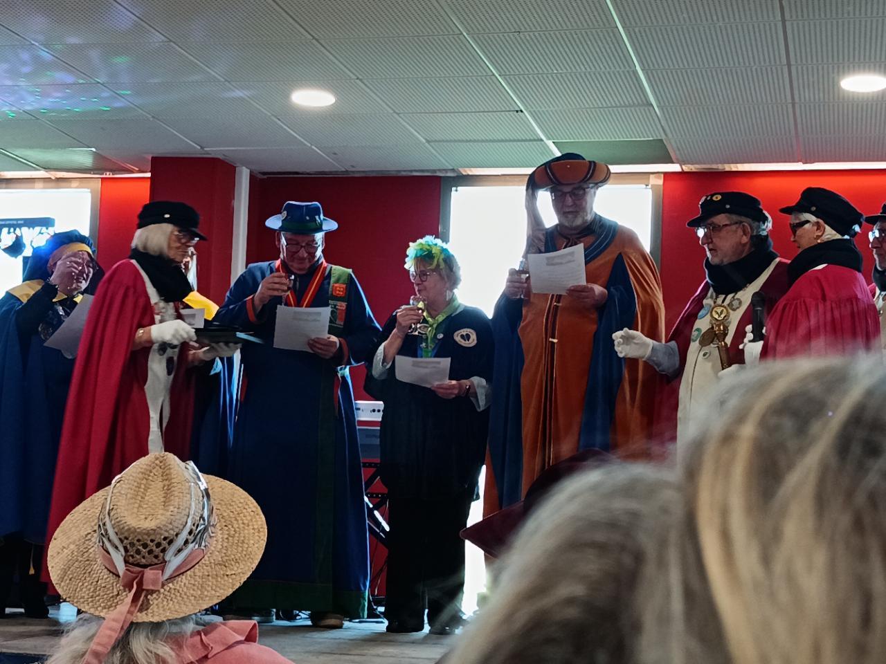 Ensuite le cortège s’est élancé dans l’avenue animé par la Joyeuse Banda. Nous avons procédé à l’intronisation de 29 confrères, dont 3 de la moule de bouchot le tout suivi d’un repas gastronomique animé par Andréa Caltagirone.
